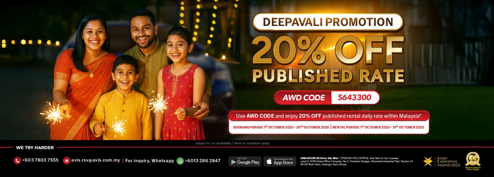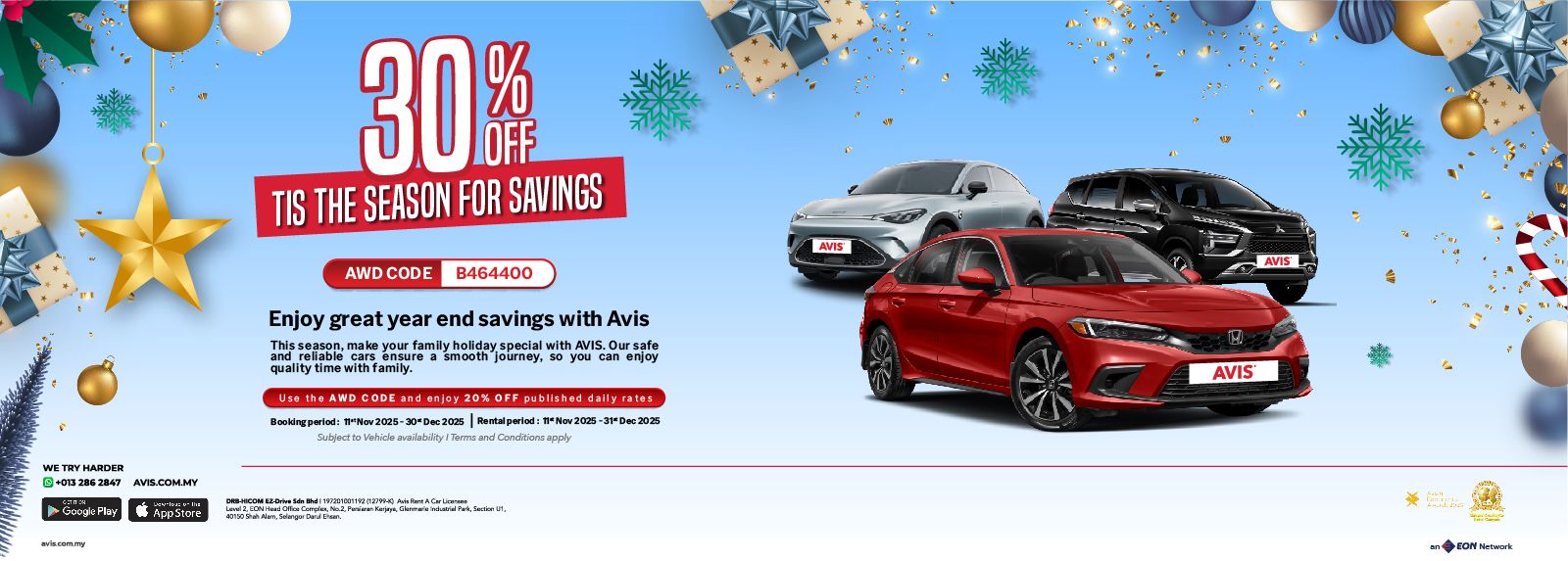 Rent a weekend drive with Avis Malaysia, and enjoy 25% off published rates via AWD No. K944100. Available Fridays(9:00am) to Mondays(9:00am) only.